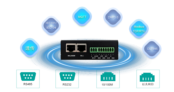 2.支持Modbus TCP/RTU、IEC101、IEC104、MQTT、透传、DNP3.0、DLT645等多种协议,并支持定制电力专属协议