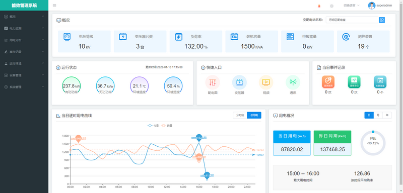 能效管理系统由通信中心、数据中心、管理平台以及用户交互层构成;数据库支持主流的关系型数据库MySql;目前web管理平台主要包括6个功能模块,概况、电力监测、用电分析、事件记录、设备管理、系统管理。