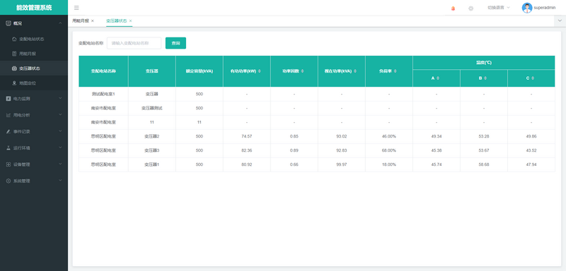 ● 变压器状态操作:显示各个配电站变压器的运行信息列表,可根据配电站名称进行信息查询。