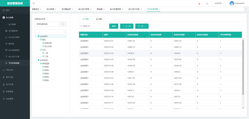 ● 平均功率因数:展示变配电站特定日期各电力设备的电度参数和平均功率因素。