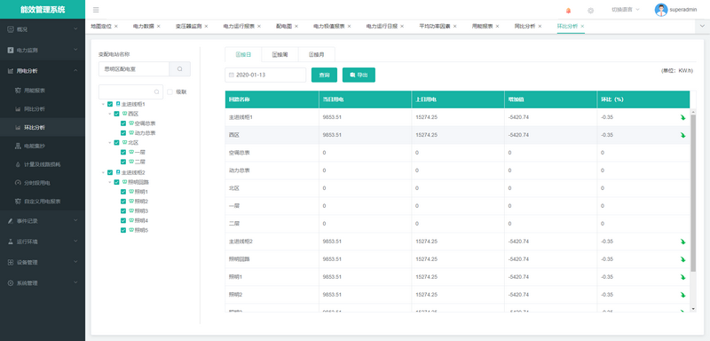 ● 环比分析:环比分析主要是分析当前日与前一日,本周与上周,本月与上月的用电情况比较。并计算出环比百分率。展示列表内容:回路名称,当前日/周/月 用电 , 上日/周/月用电,增加值,环比值,标志(上涨/下降)