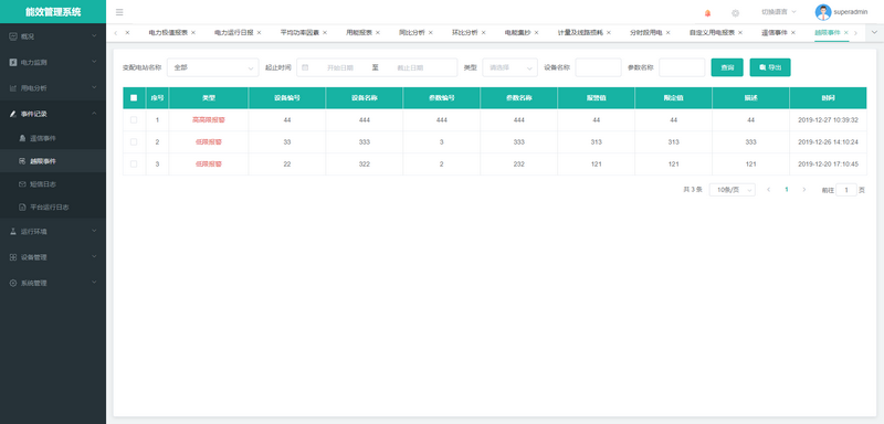 ● 越限事件:显示记录所有设备遥信告警信息以及对信息进行导出操作。